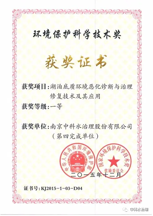 2015年,中科水治理技術(shù)獲得國家環(huán)保部頒發(fā)的環(huán)境保護科學(xué)技術(shù)一等獎。
