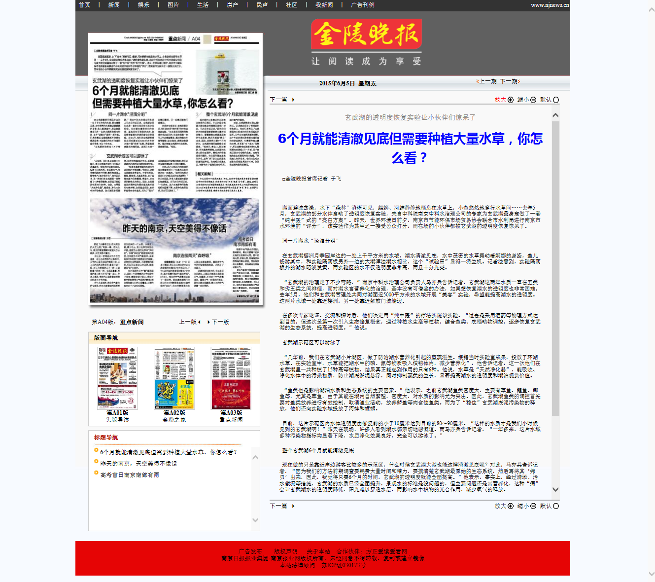 中國環(huán)保新聞網(wǎng)綠色南京頻道對中科水治理采取的純生態(tài)治水法表示贊揚,認為應該推廣應用,并對水體透明度、水質治理效果給與積極肯定。
