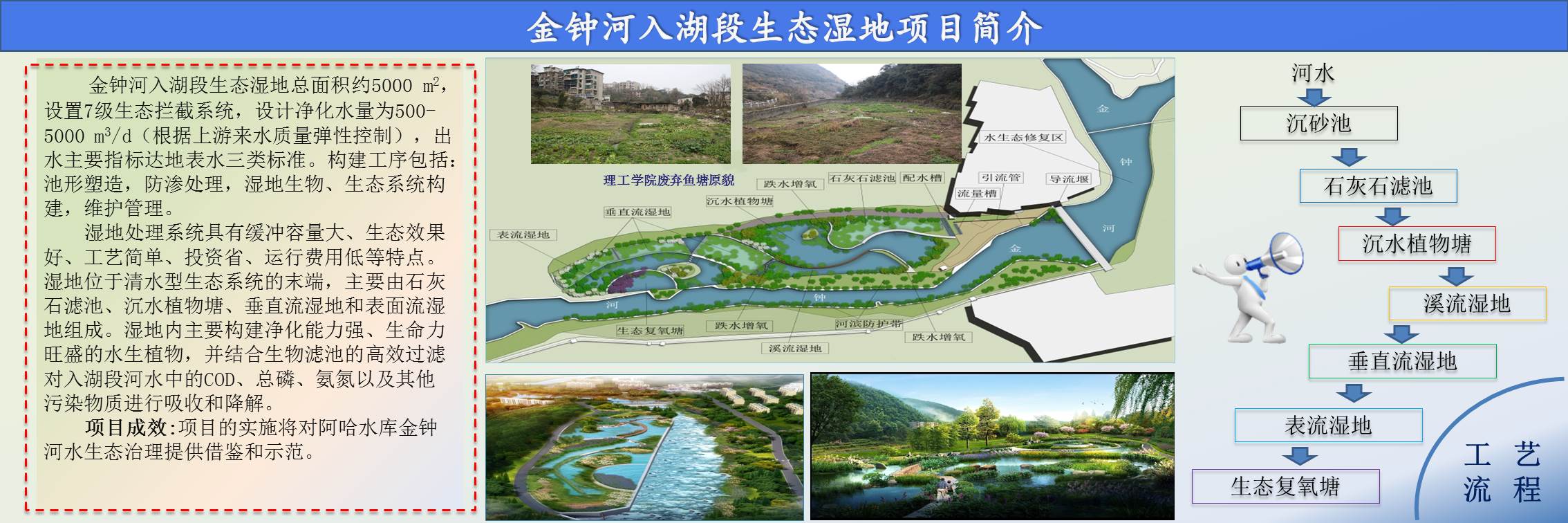 隨著經(jīng)濟社會的快速發(fā)展、城市人口的迅速增長,城市污水處理設施、收集管網(wǎng)建設嚴重滯后,黑臭河道問題長時間無法解決。今年年初,貴州省政府印發(fā)《貴州省水污染防治行動計劃工作方案》:明確到2017年,貴陽市建成區(qū)基本消除黑臭水體。在此背景下,貴陽市兩湖一庫管理局對阿哈水庫流域進行綜合整治。阿哈水庫金鐘河入湖段生態(tài)治理項目是阿哈水庫流域進行綜合整治的項目之一,為防治環(huán)境污染,充分發(fā)揮和強化河流自身的凈化能力,同時兼顧景觀設計,采用我公司清水型生態(tài)系統(tǒng)構建技術對金鐘河流域水體污染進行防治。