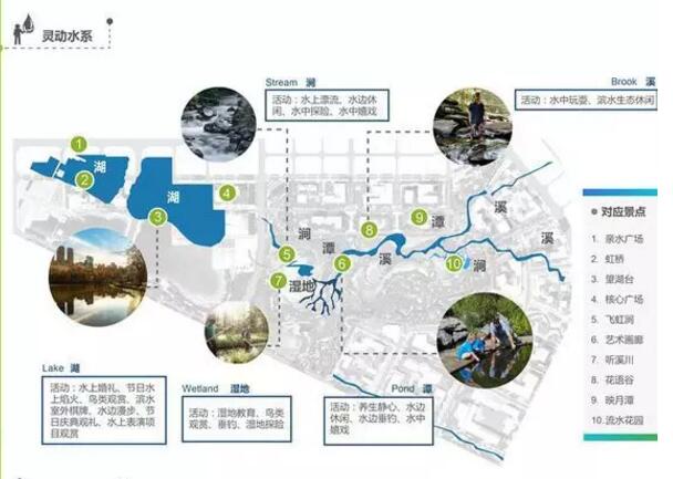 靈動水系是新川之心的三大核心元素之一,涵蓋了湖泊、濕地、潭、溪、澗等多種表現方式,其中西區的兩個人工湖是水系的中堅力量。